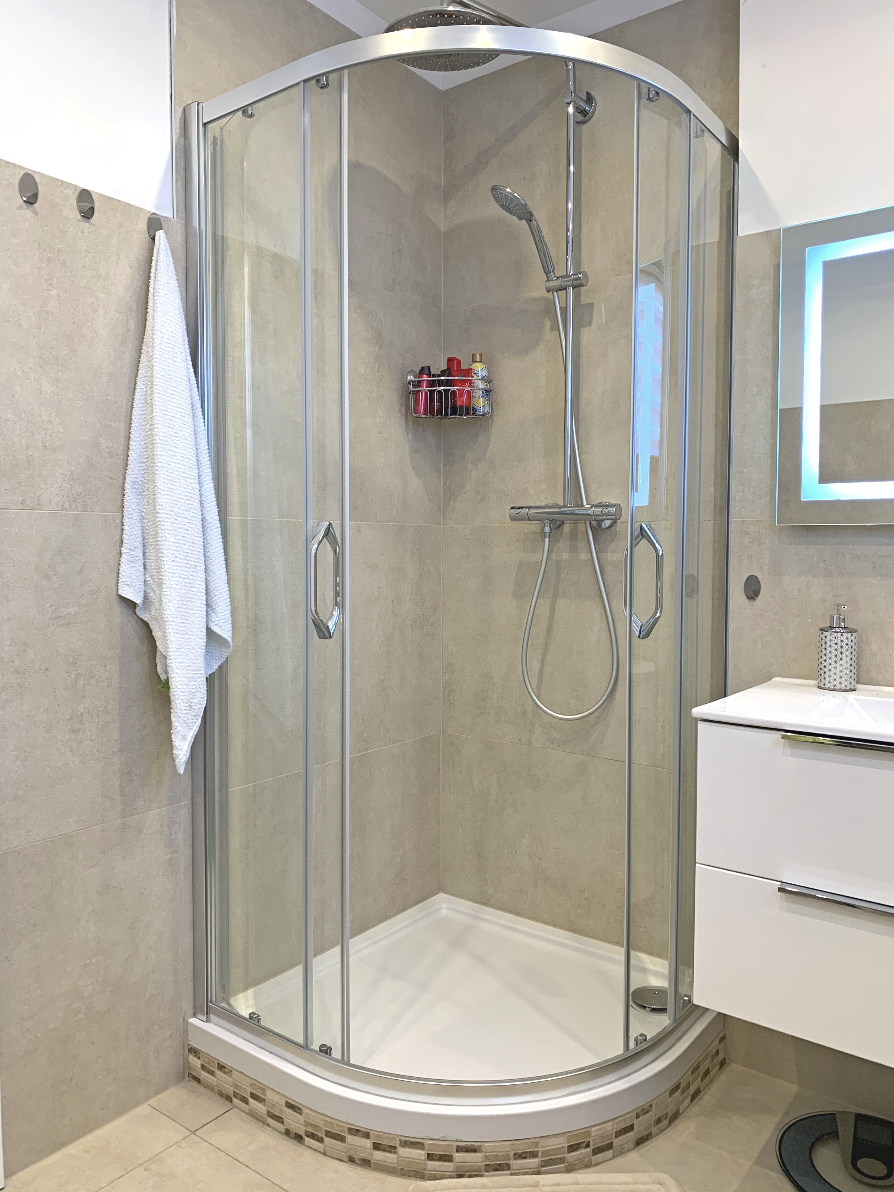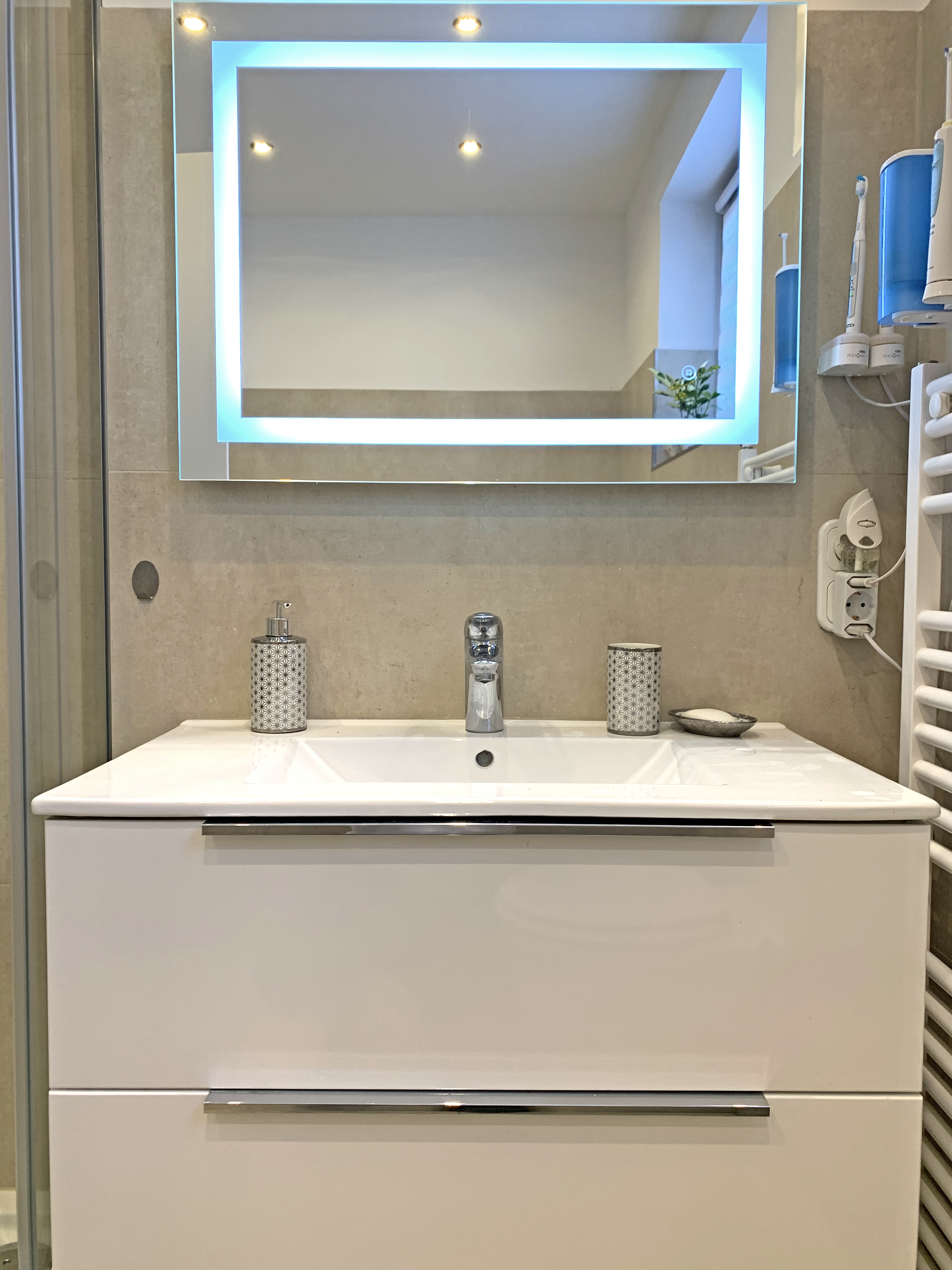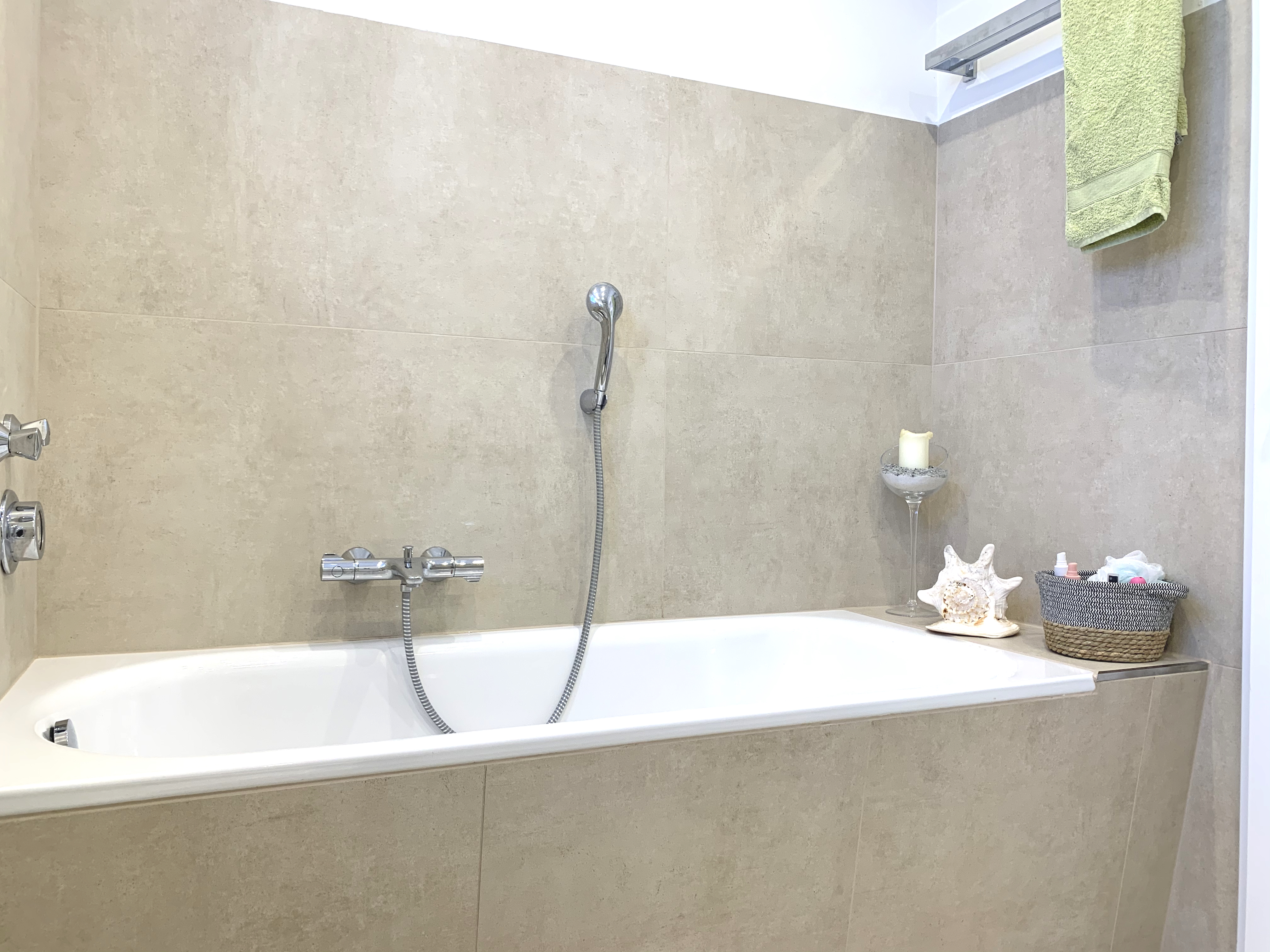 Das Tageslicht-Bad verfügt über eine Dusche, eine Badewanne und ist mit modernen Fliesen im Großformat sowie zeitlosen Santitärobjekten ausgestattet.
