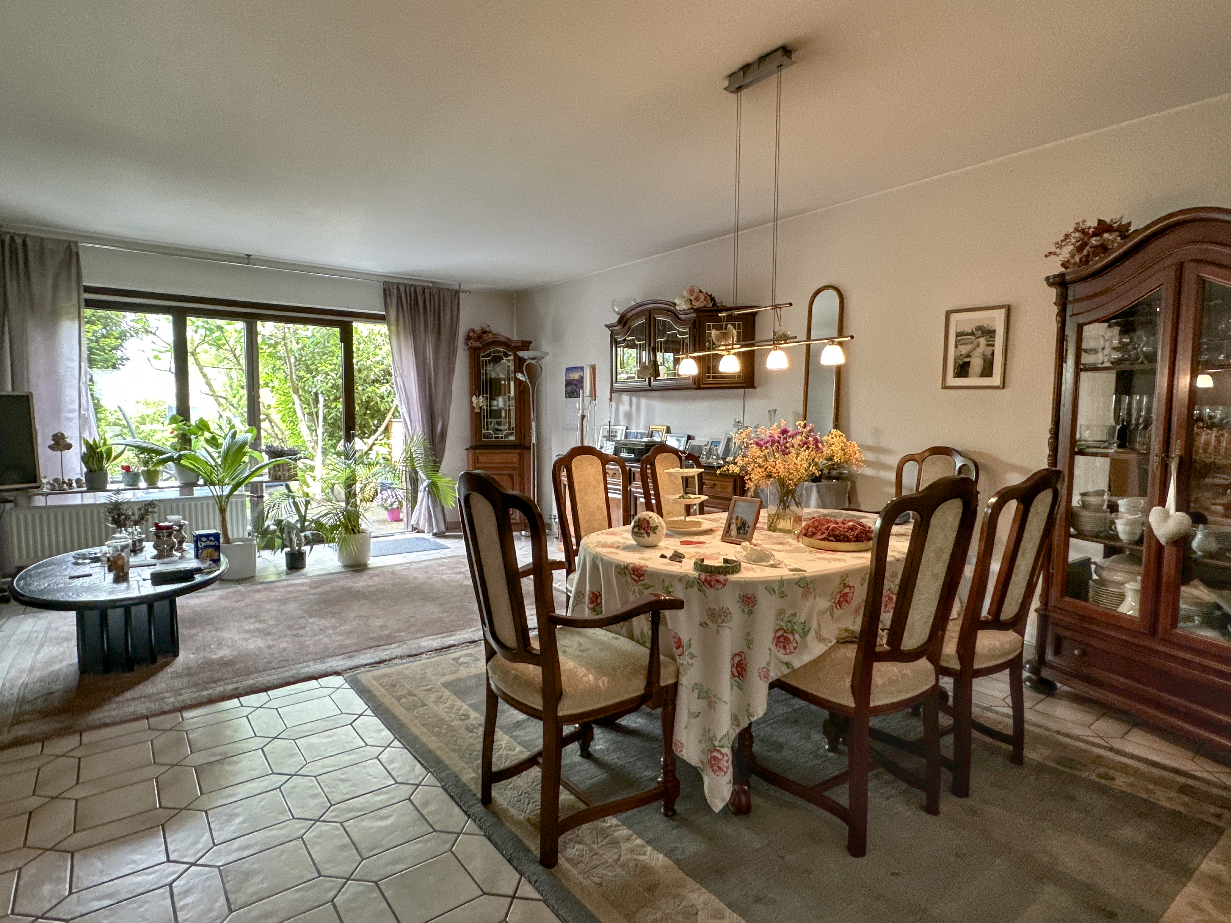 Große Fensterflächen im offenen und hellen Wohn- Essbereich schaffen eine einladende Atmosphäre die das Wohnzimmer zu einem idealen Ort für Entspannung und Unterhaltung machen. Die Fenster verfügen über Isolierverglasung und sind teilweise mit Außenrolläden ausgestattet.