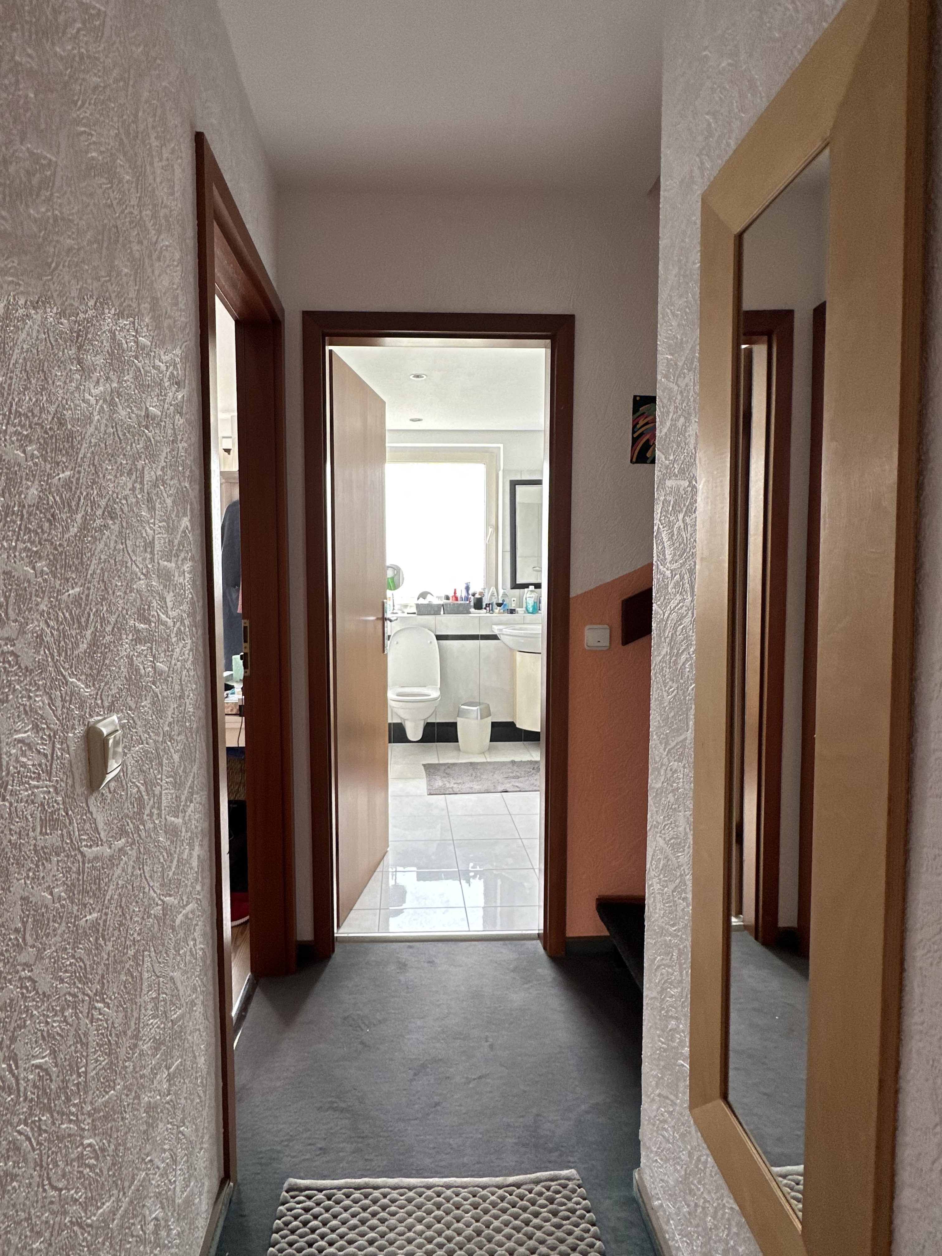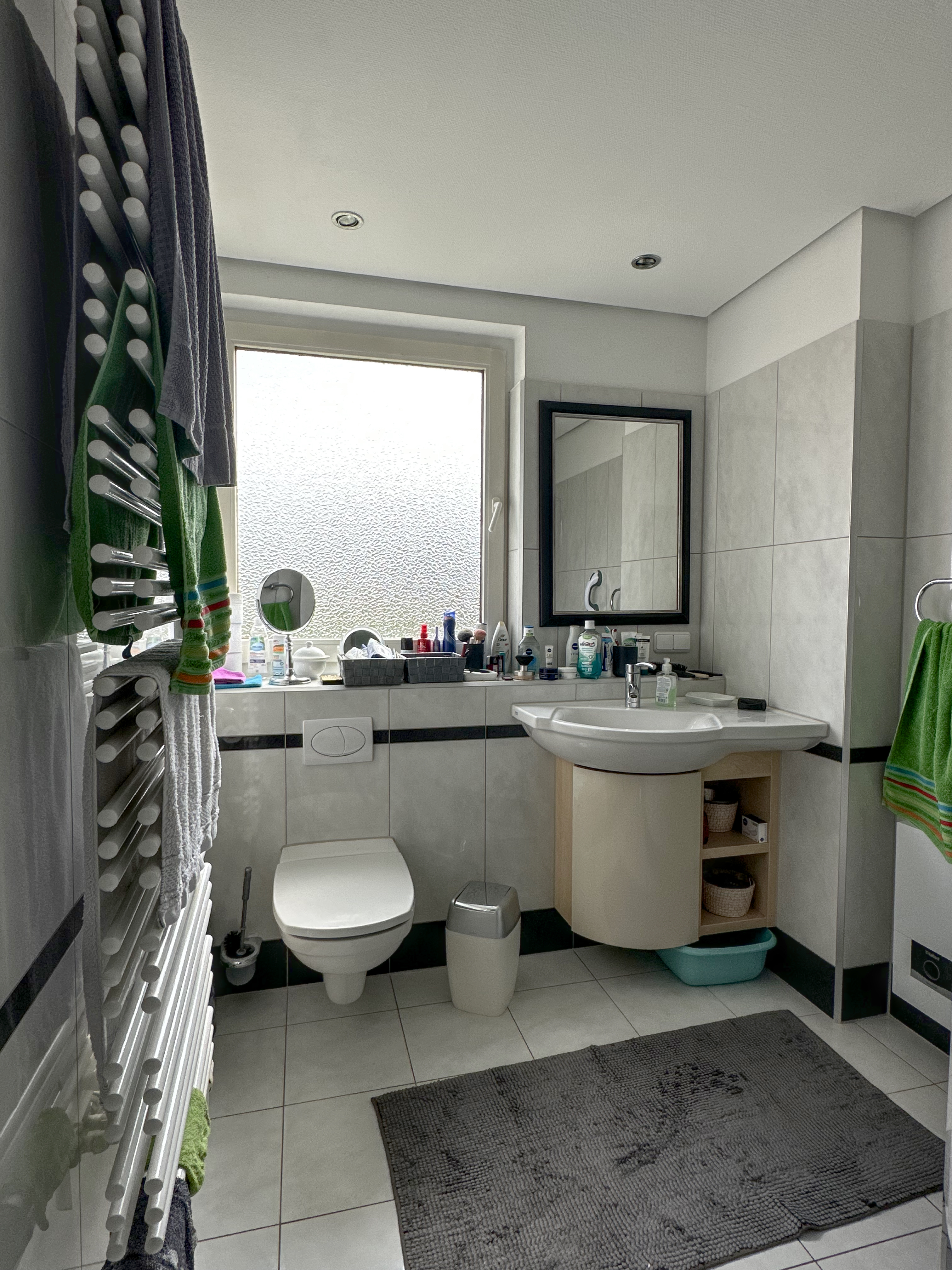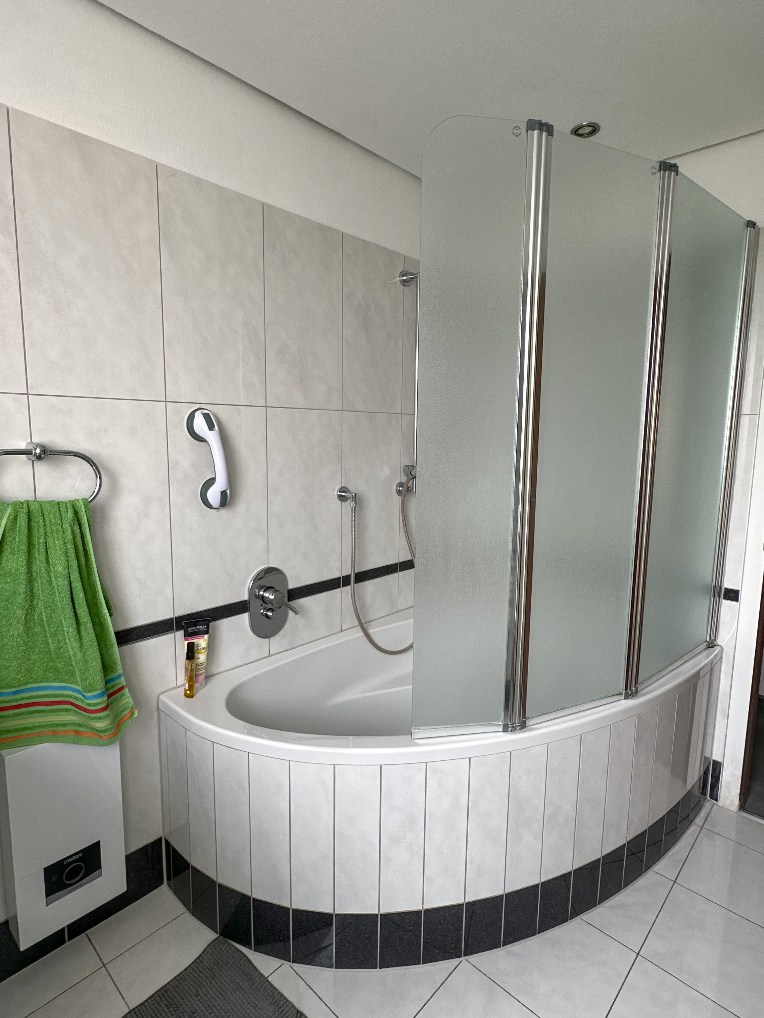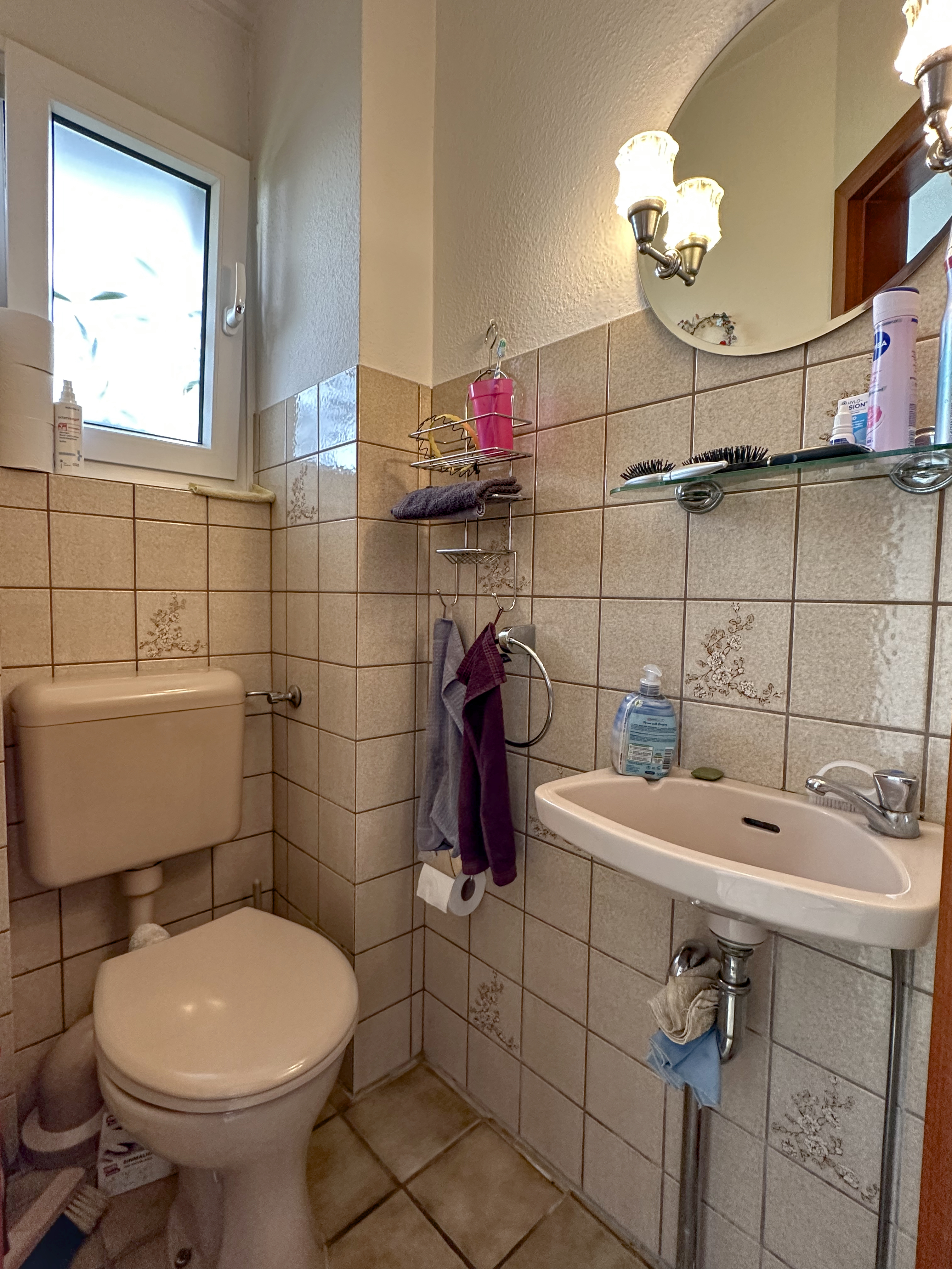 Es stehen Ihnen ein komplett ausgestattetes Badezimmer mit hellen Wand- und Bodenfliesen im Obergeschoss samt Badewanne sowie ein Gäste-WC im Erdgeschoss zur Verfügung.