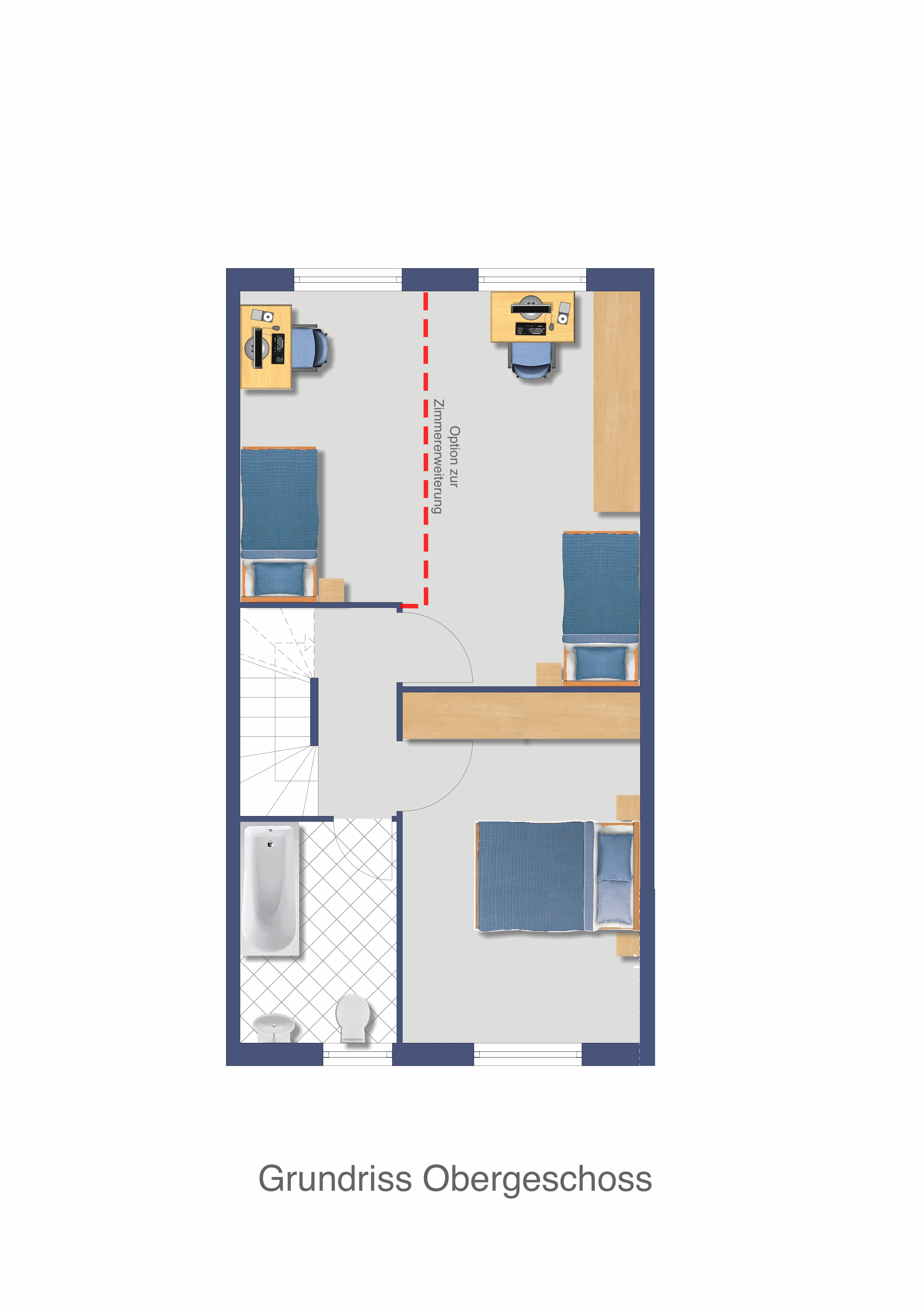 Die Wohnfläche von ca. 100 m2 bietet Platz für 4 Zimmer mit einem gradlinigen und modernen Grundriss. Optional kann ein Zimmer im Obergeschoss geteilt werden, wodurch ein weiteres Zimmer geschaffen wird und die Gesamtanzahl an Zimmer von 4 auf 5 erhöht wird. Diese flexible Raumnutzung ermöglicht es, den Wohnraum nach individuellen Bedürfnissen anzupassen und weitere Möglichkeiten zu schaffen ( Homeoffice, Kinder- bzw. Gästezimmer etc. ).