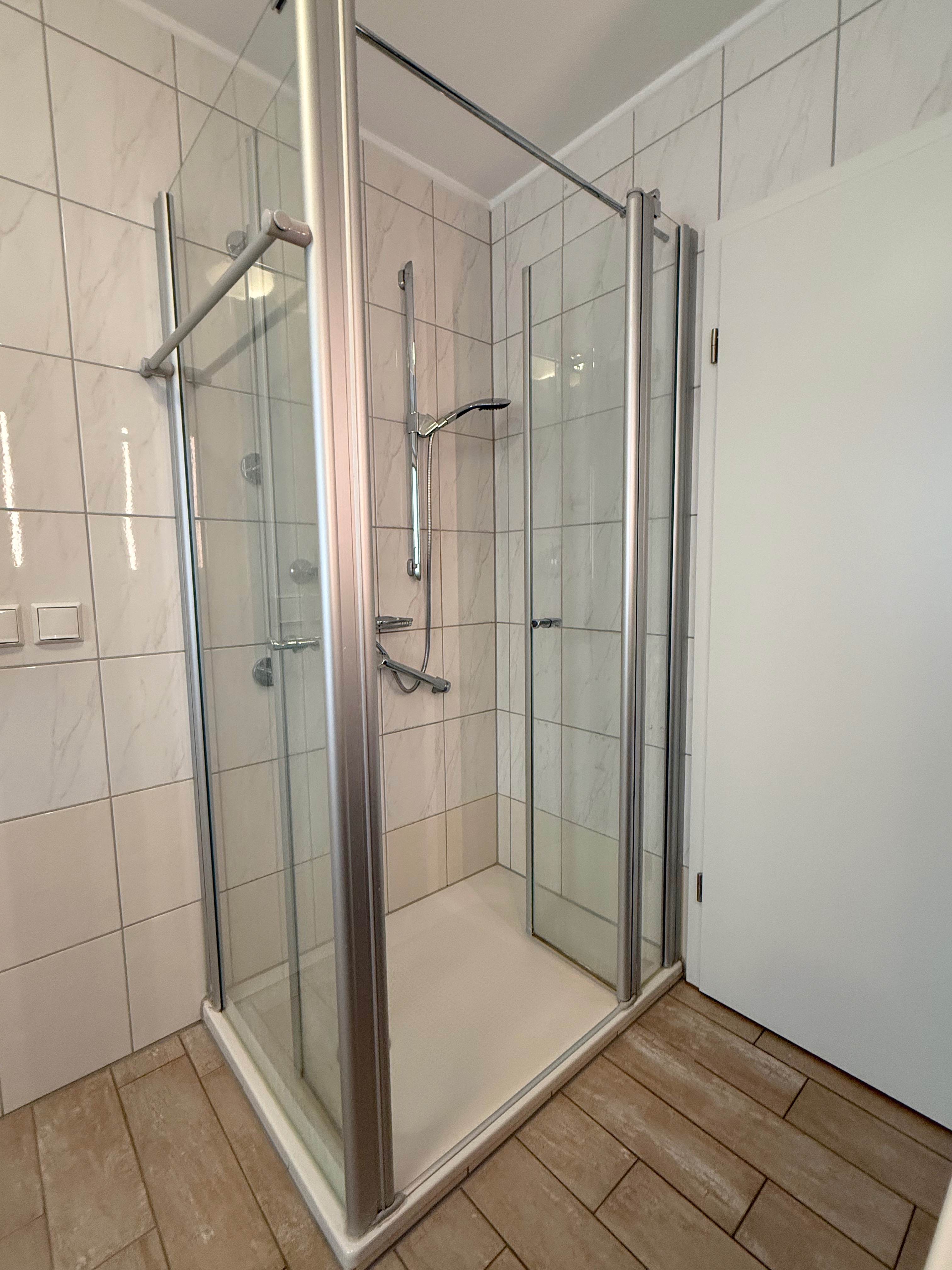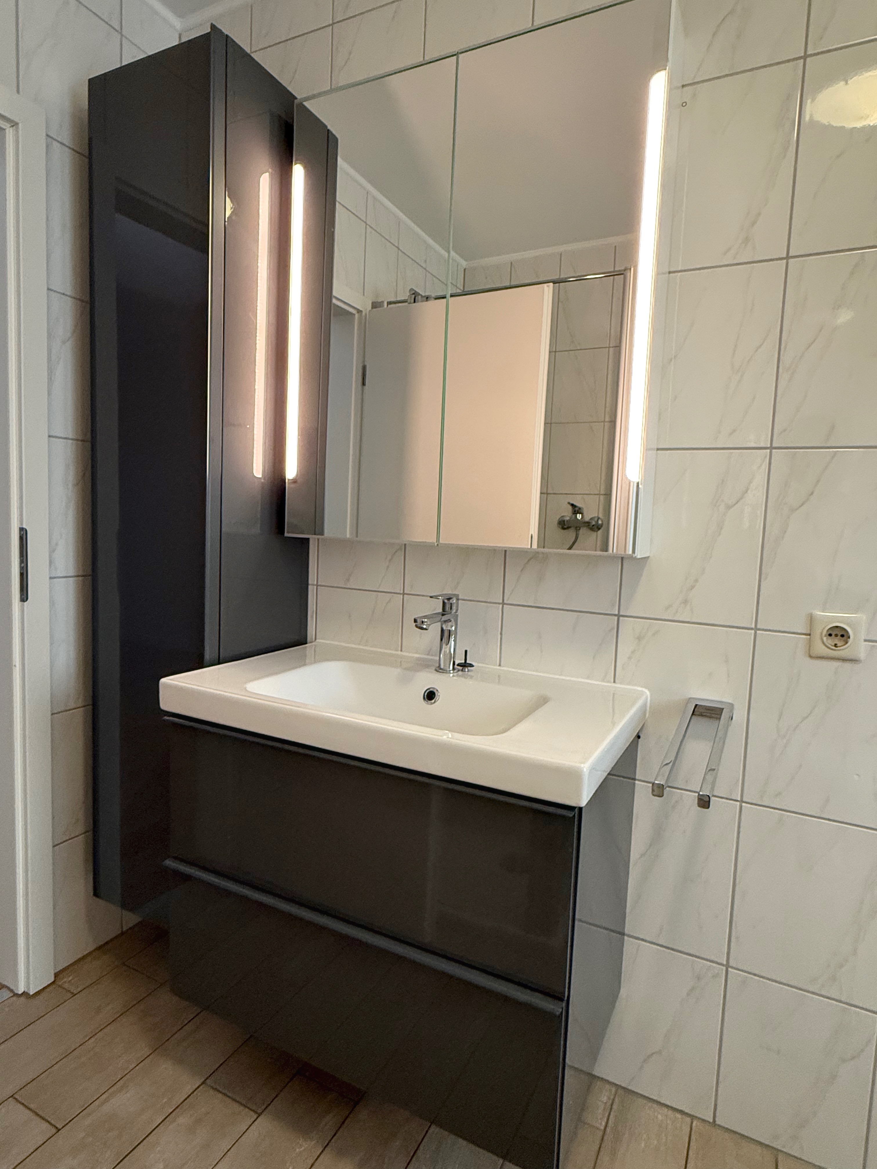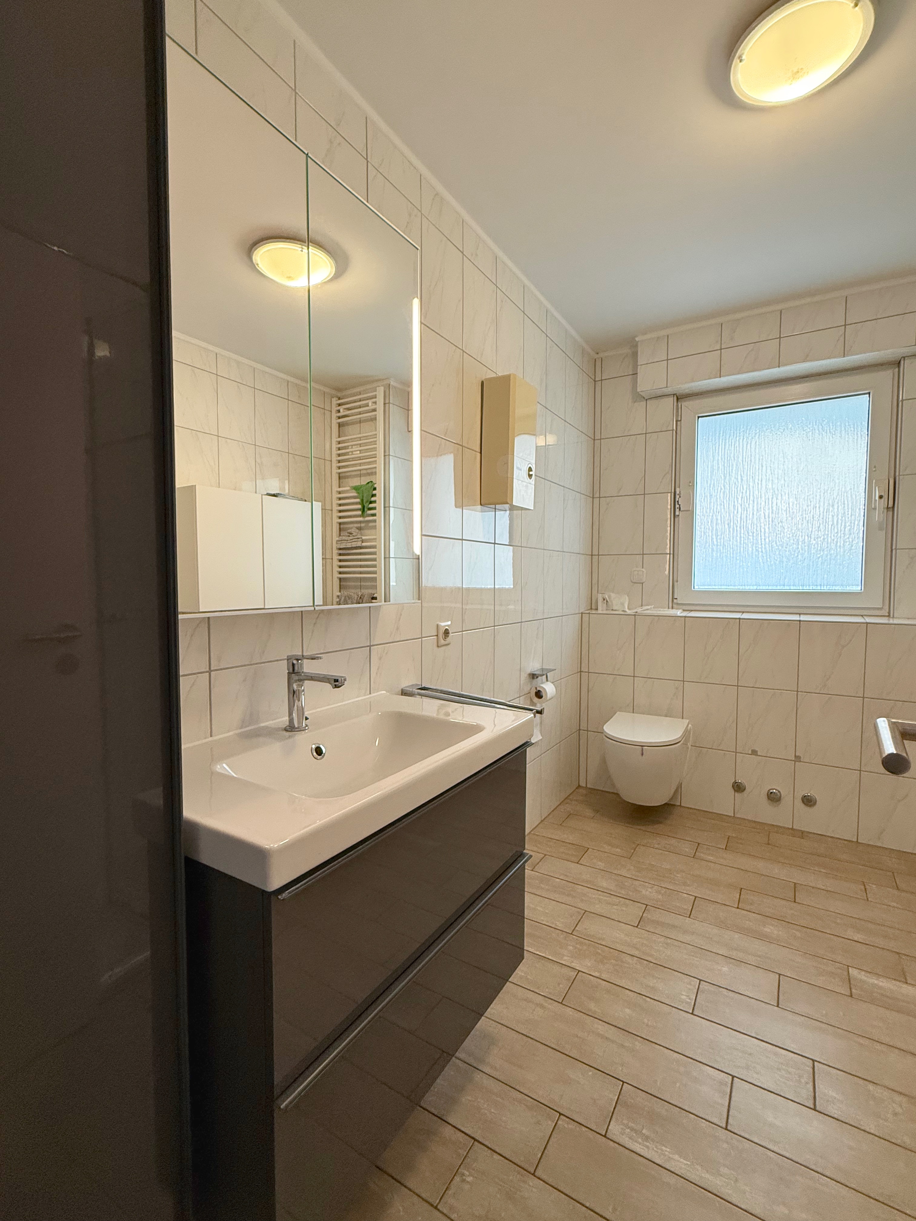Die Bodenbeläge in der Wohnung bestehen aus Fliesen und einem hochwertigen Parkettboden. Neuwertige Innentürzargen und Türblätter sowie die neuwertigen und modernen Badmöbel tragen zu der umfangreichen Ausstattung bei.