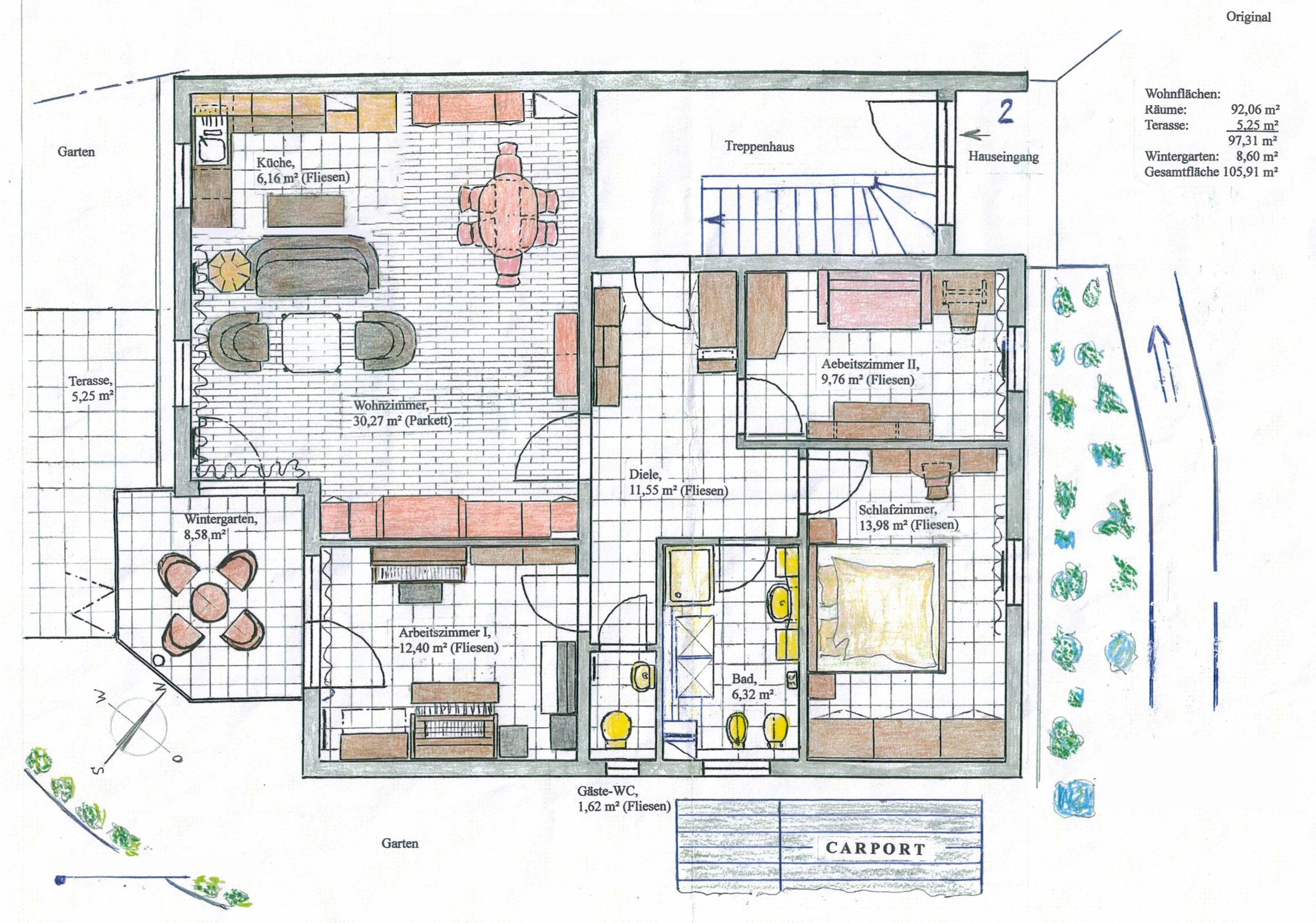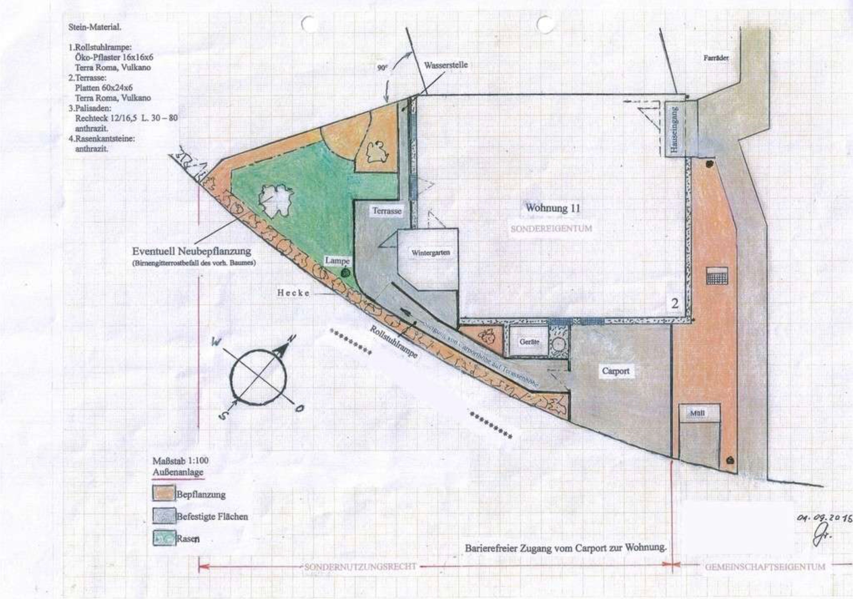 Von der Terrasse gelangt man barrierefrei über einen Weg direkt zum Carport mit 2 PKW – Stellplätzen. Somit verfügt die Wohnung über einen abgeschlossenen Außenbereich zur alleinigen Nutzung, der Begriff – Haus im Haus – ist hier wirklich zutreffend.