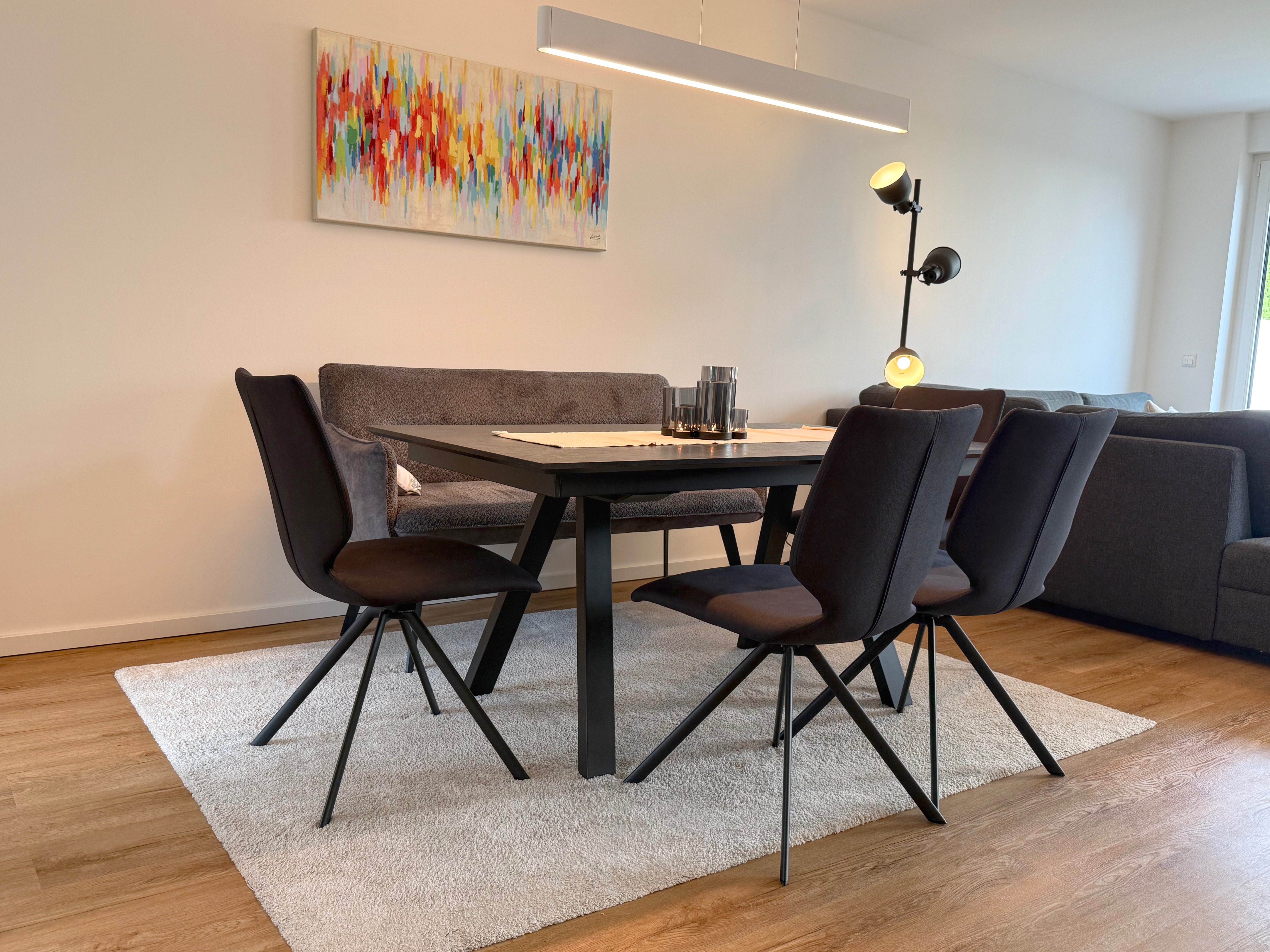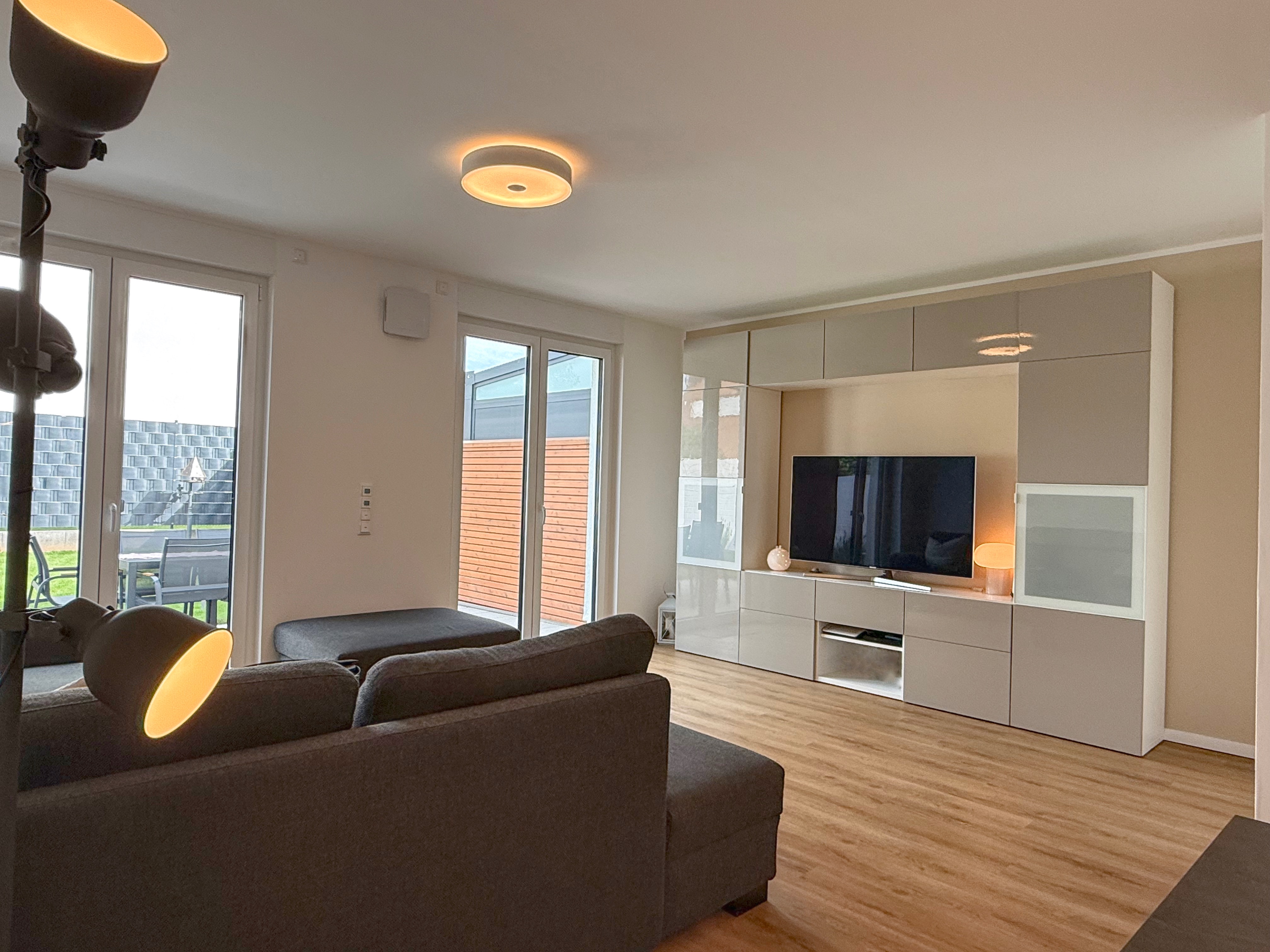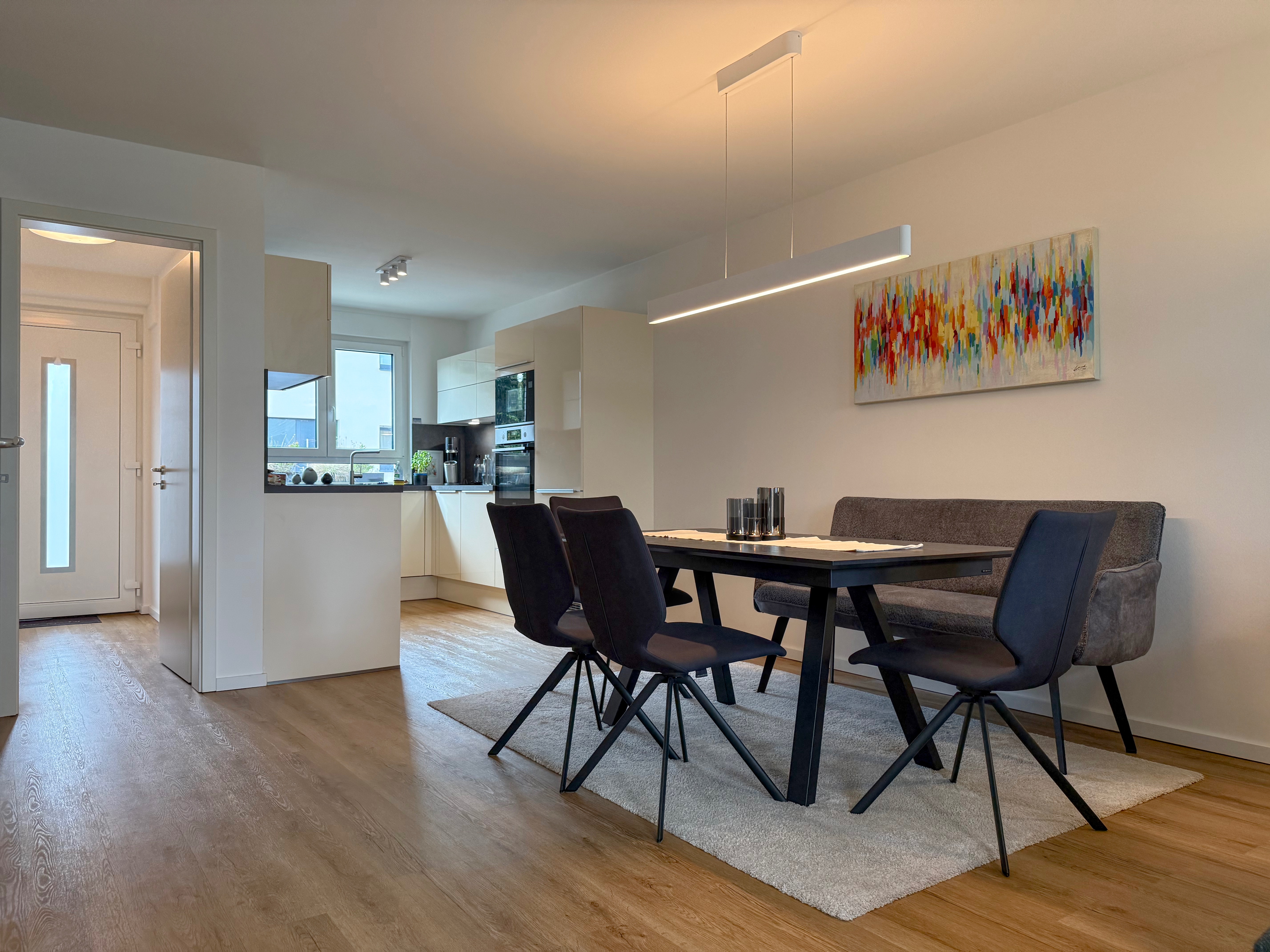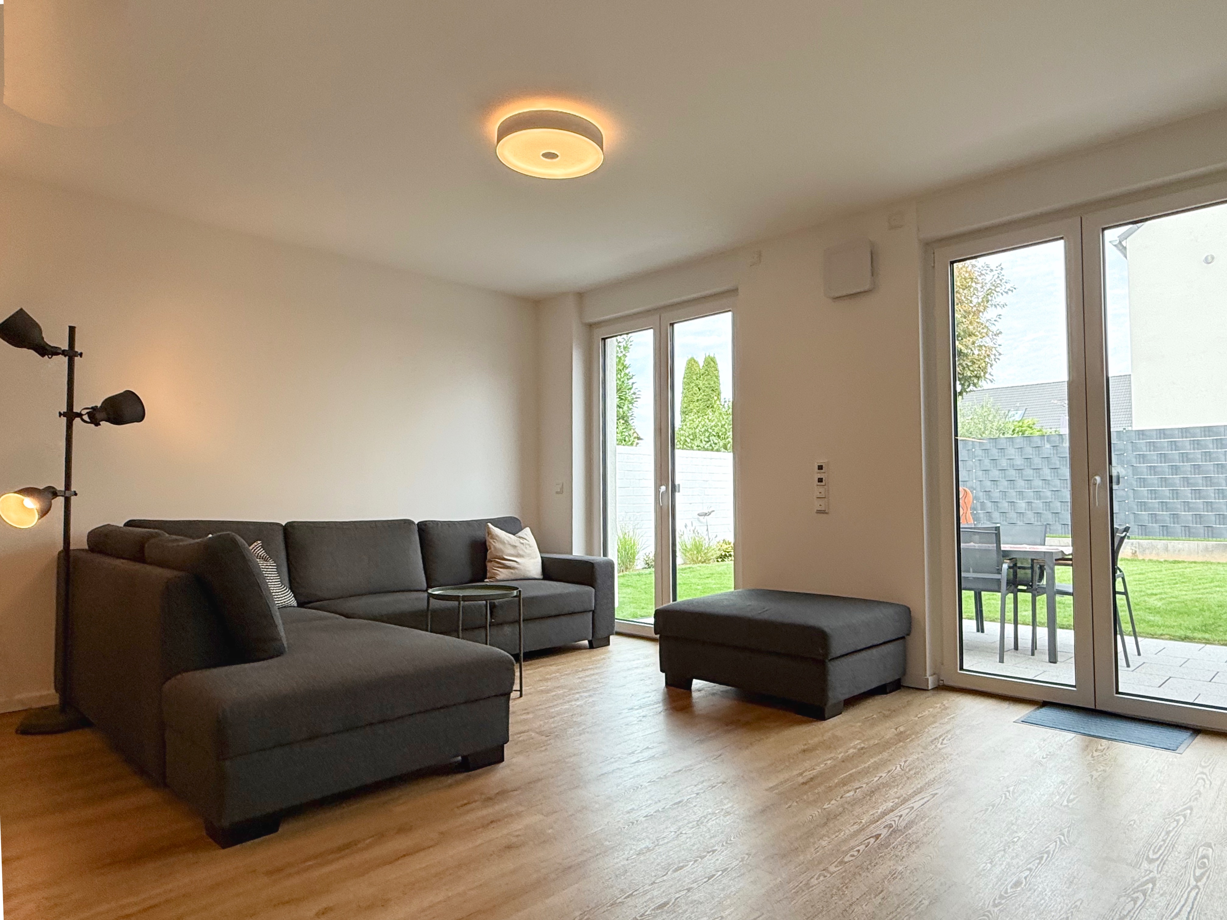 Der offene Wohn- und Essbereich bildet das Herzstück des Hauses. Große Fensterflächen durchfluten den Raum mit Tageslicht und ermöglichen einen schönen Blick in den Garten. Terrasse und Außenbereich sind pflegeleicht gestaltet, bieten Platz zum Entspannen oder für gesellige Stunden im Freien und gewähren dabei ein hohes Maß an Privatsphäre.