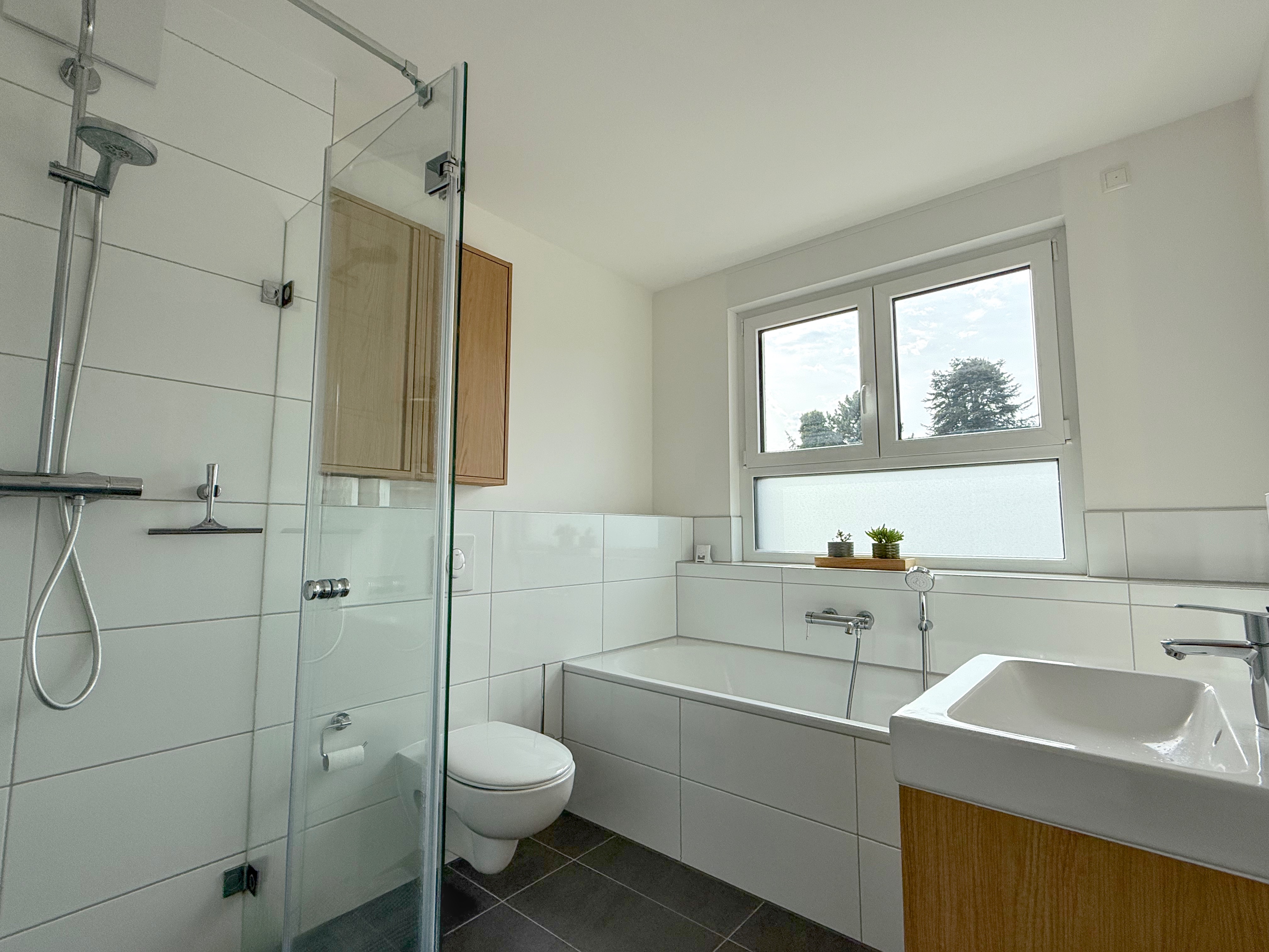 • Tageslichtbad mit modernen Fliesen, Dusche und Badewanne