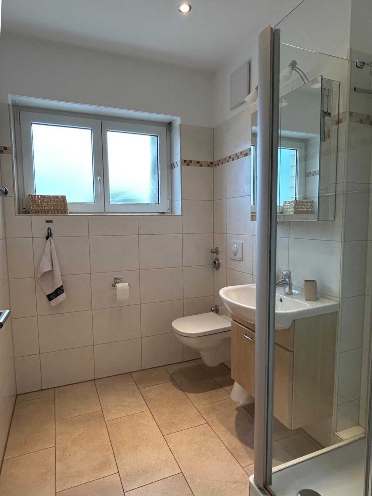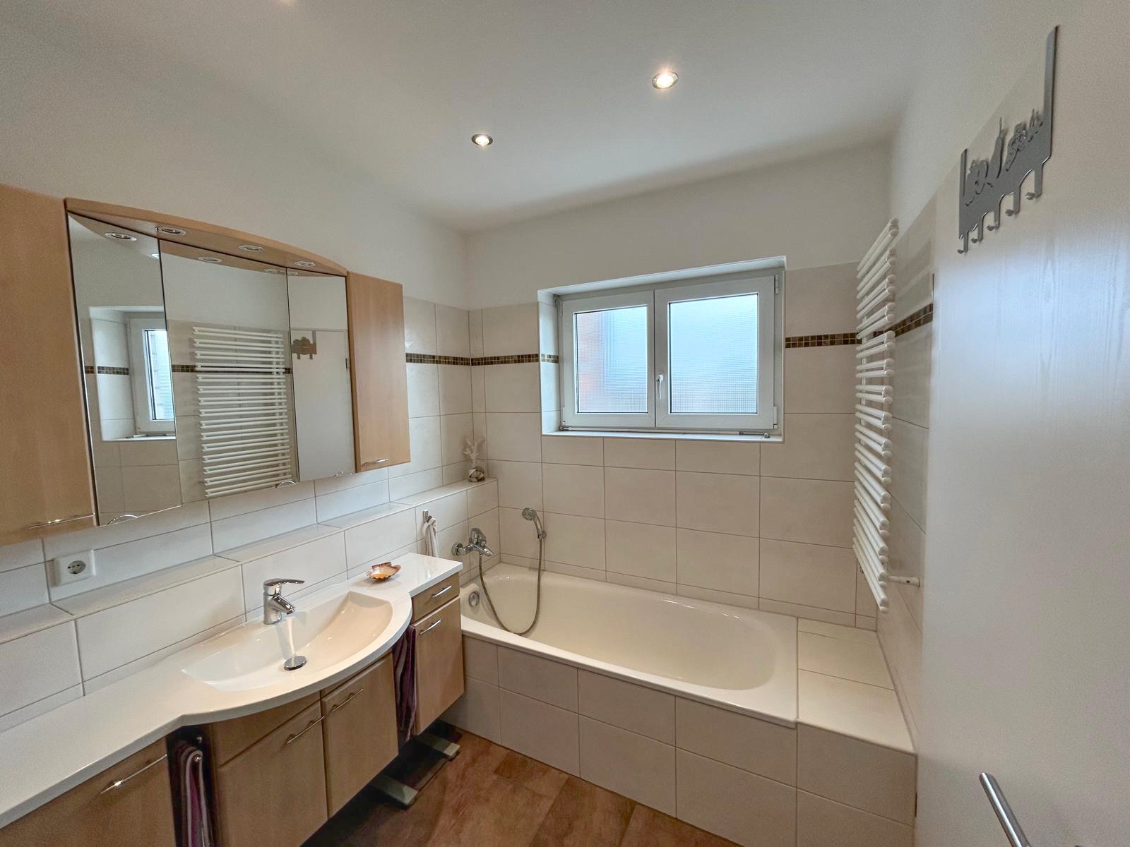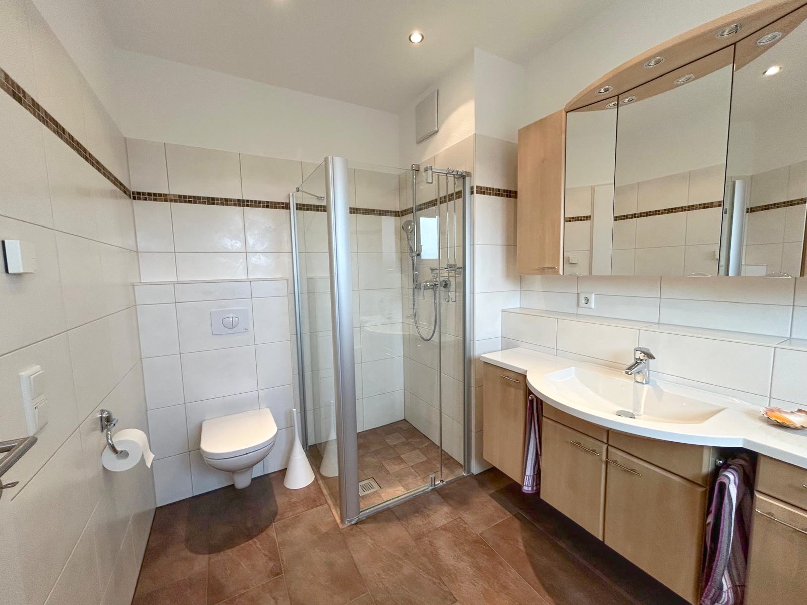 Das Tageslicht – Haupt-Bad verfügt über eine bodenebene Duschkabine und eine Badewanne. Alle Sanitärobjekte sind in der Farbe Weiß gehalten, die gesamte Ausstattung ist sehr hochwertig.