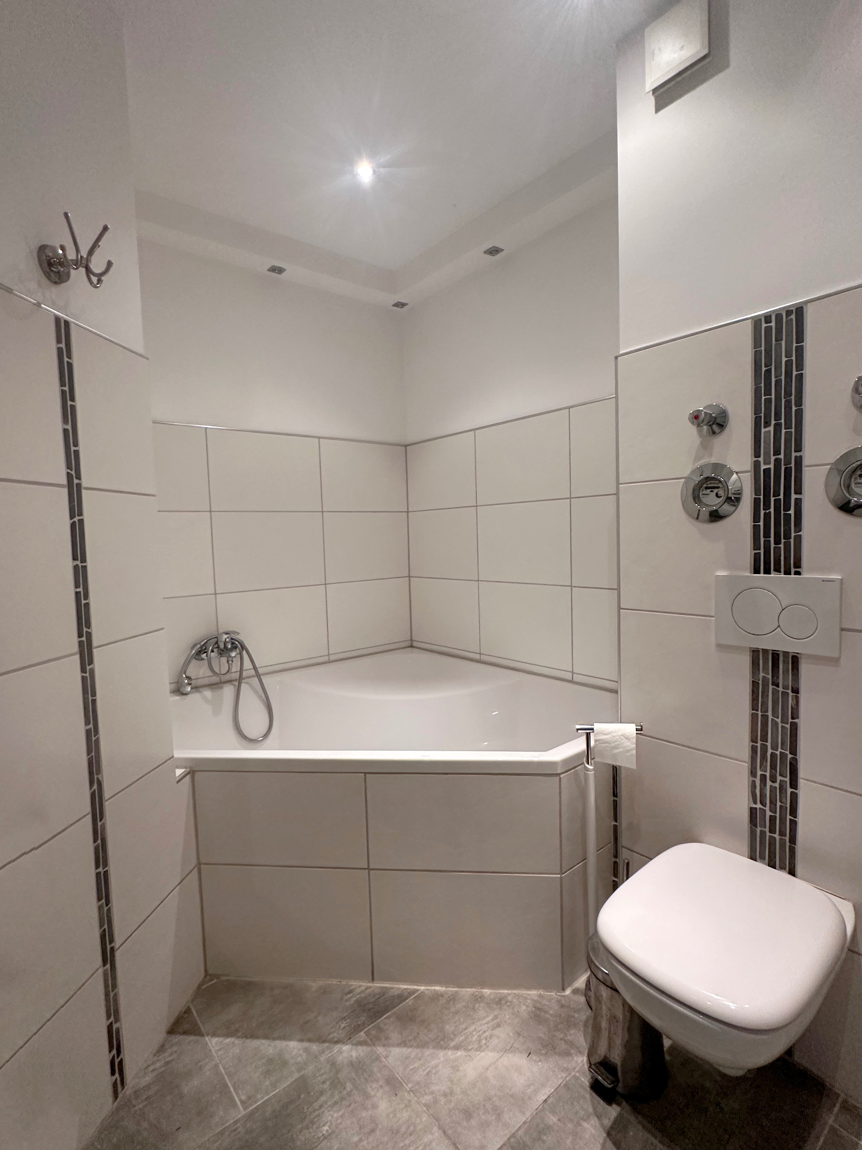 Das modernisierte Badezimmer ist mit einer großen Eckbadewanne sowie einer separaten Dusche ausgestattet. Ein zusätzliches, ebenfalls modernisiertes Gäste-WC erhöht den Komfort im Alltag.