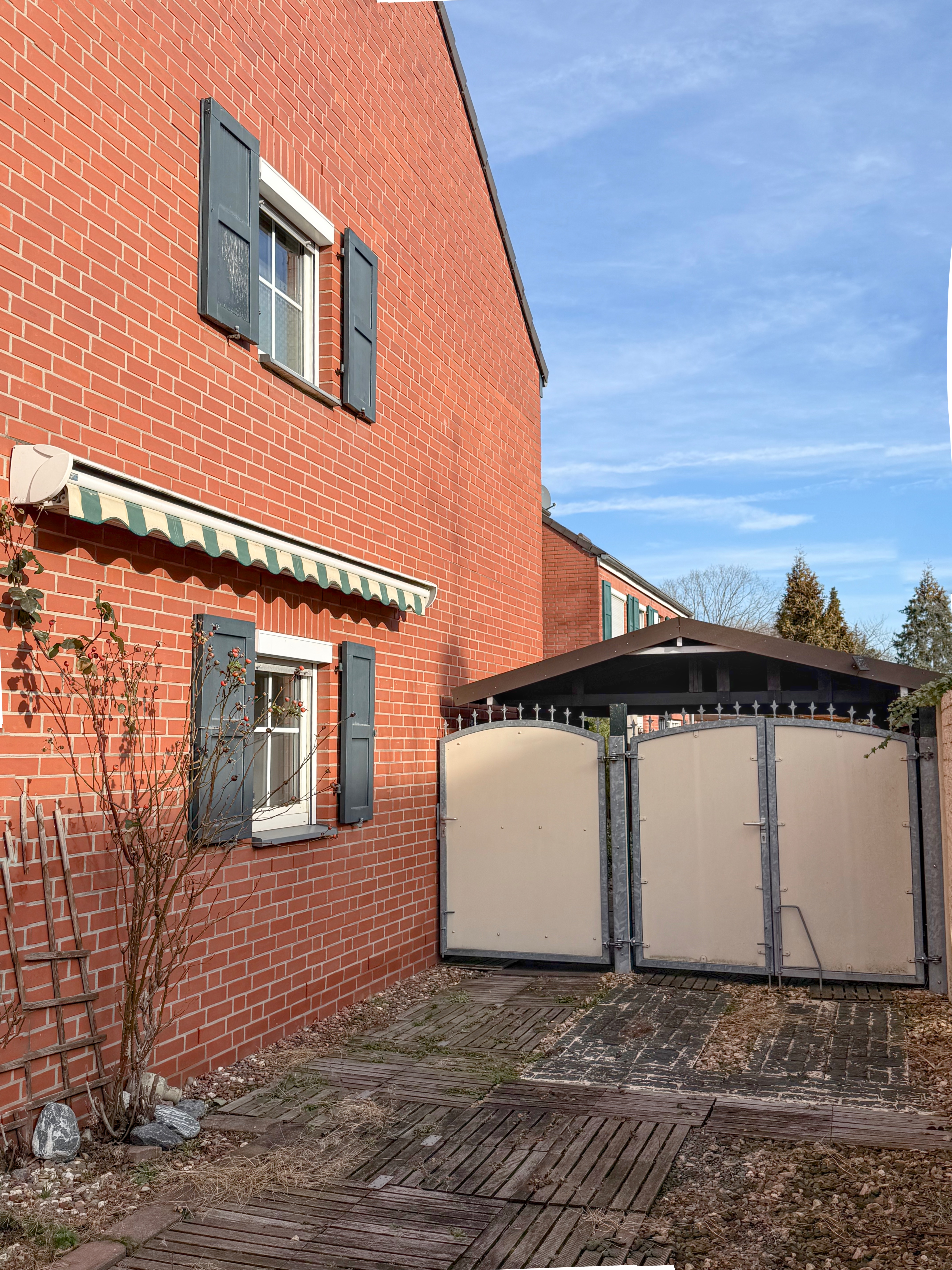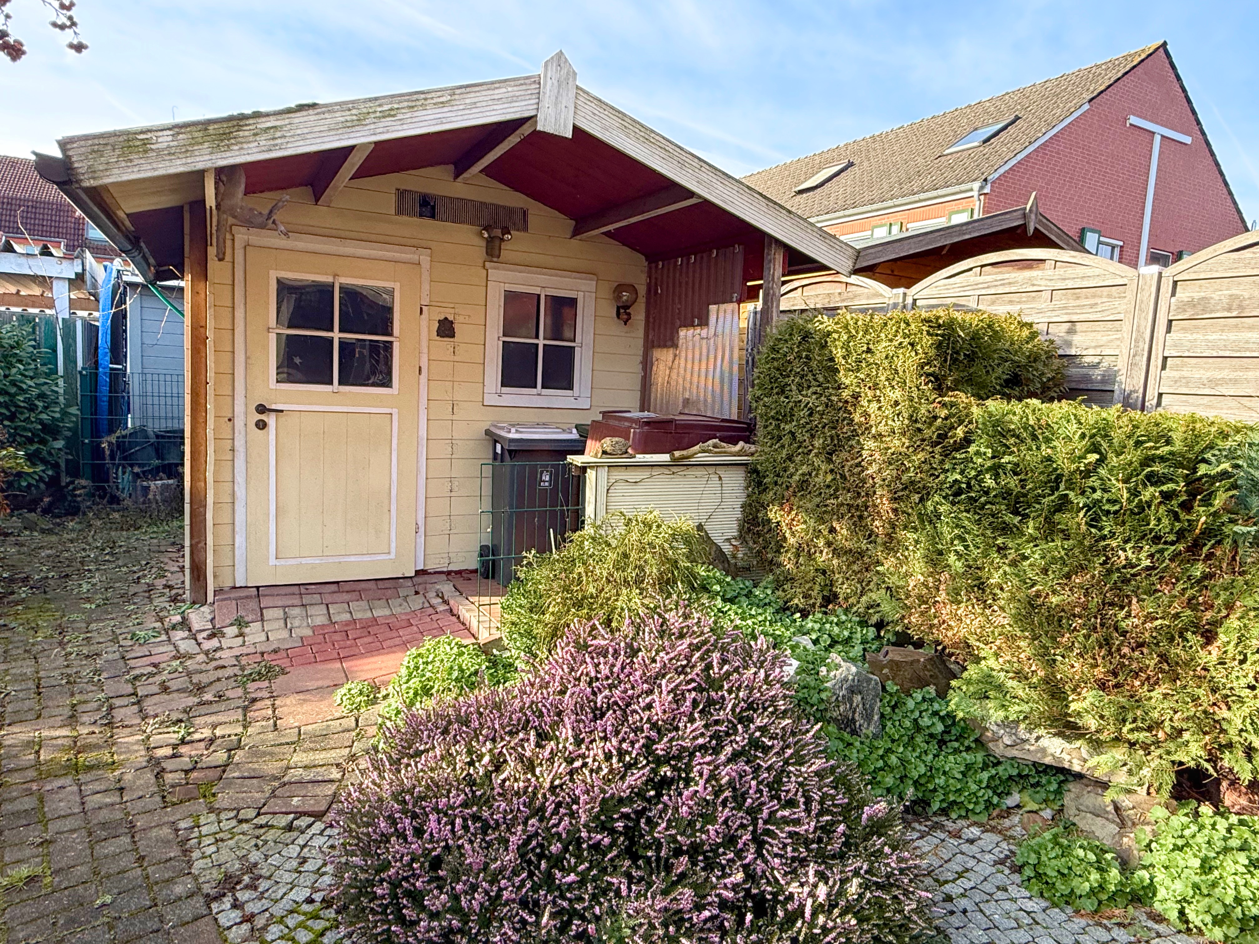 Der Außenbereich überzeugt mit einem pflegeleichten Sonnengarten in Süd-/West-Ausrichtung, einer überdachten Terrasse sowie einem massiven Gartenhaus, das zusätzlichen Stauraum bietet. Für Fahrzeuge stehen ein hochwertiger Carport direkt am Haus sowie ein weiterer PKW-Stellplatz im Carport-Hof zur Verfügung.