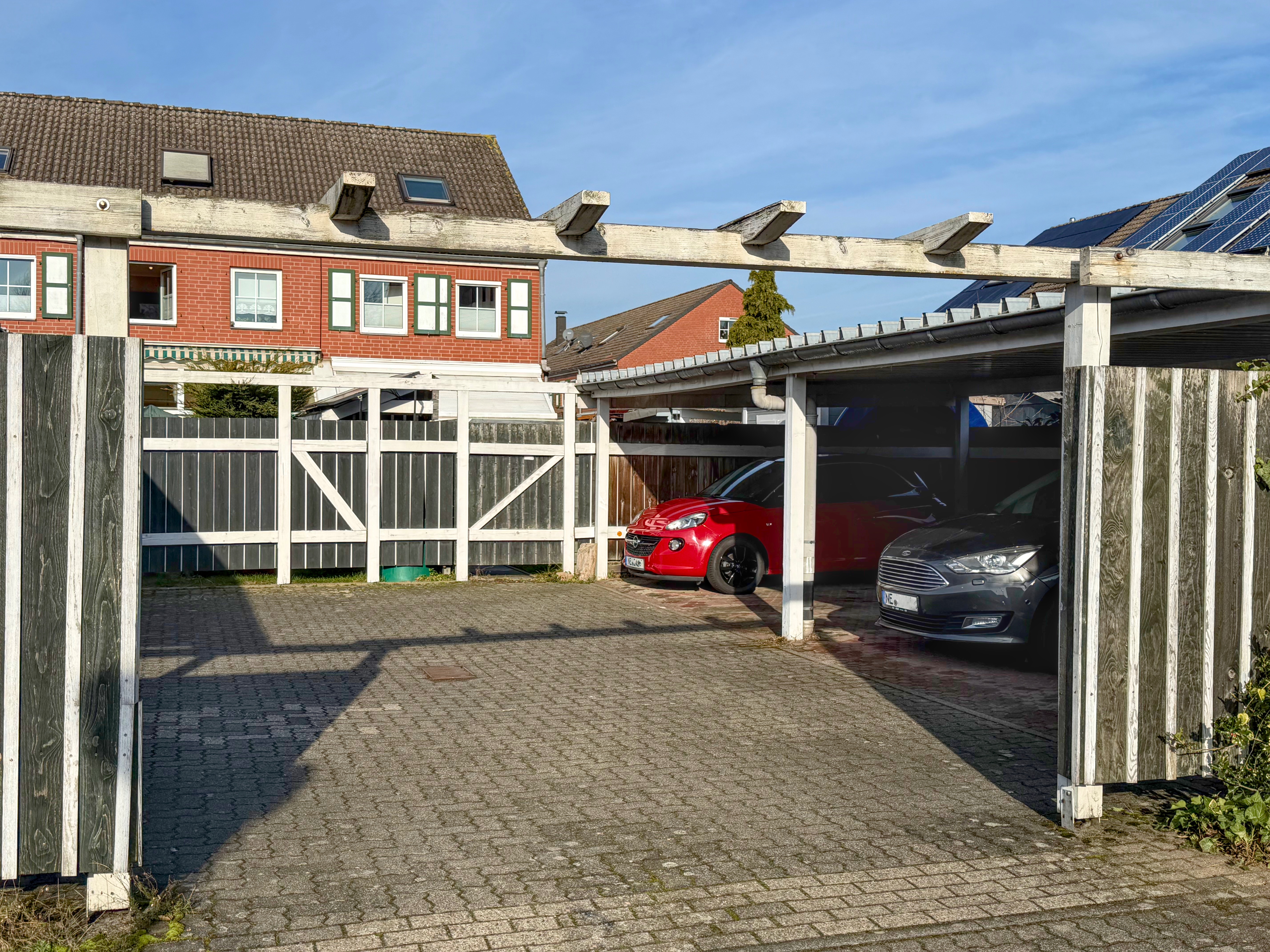 * Ein Carport direkt am Gebäude und ein Carport hinter dem Garten