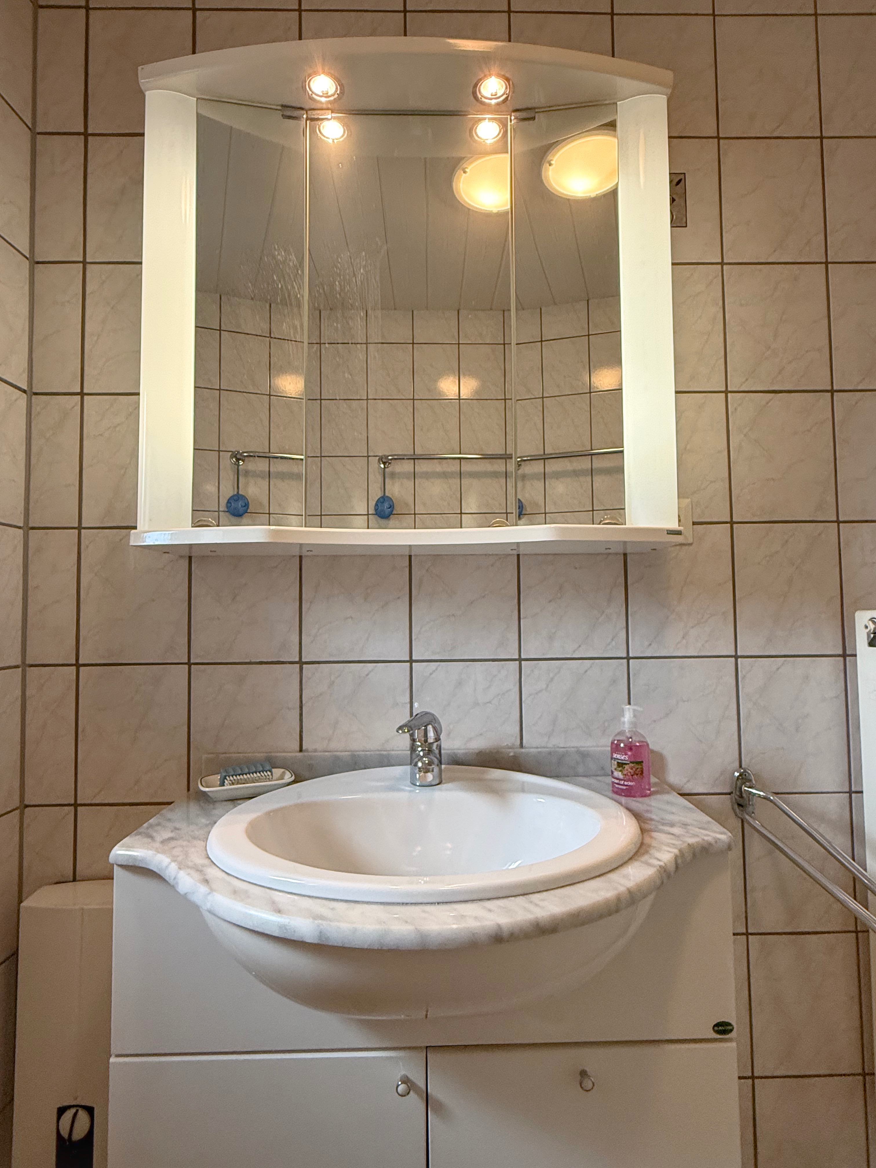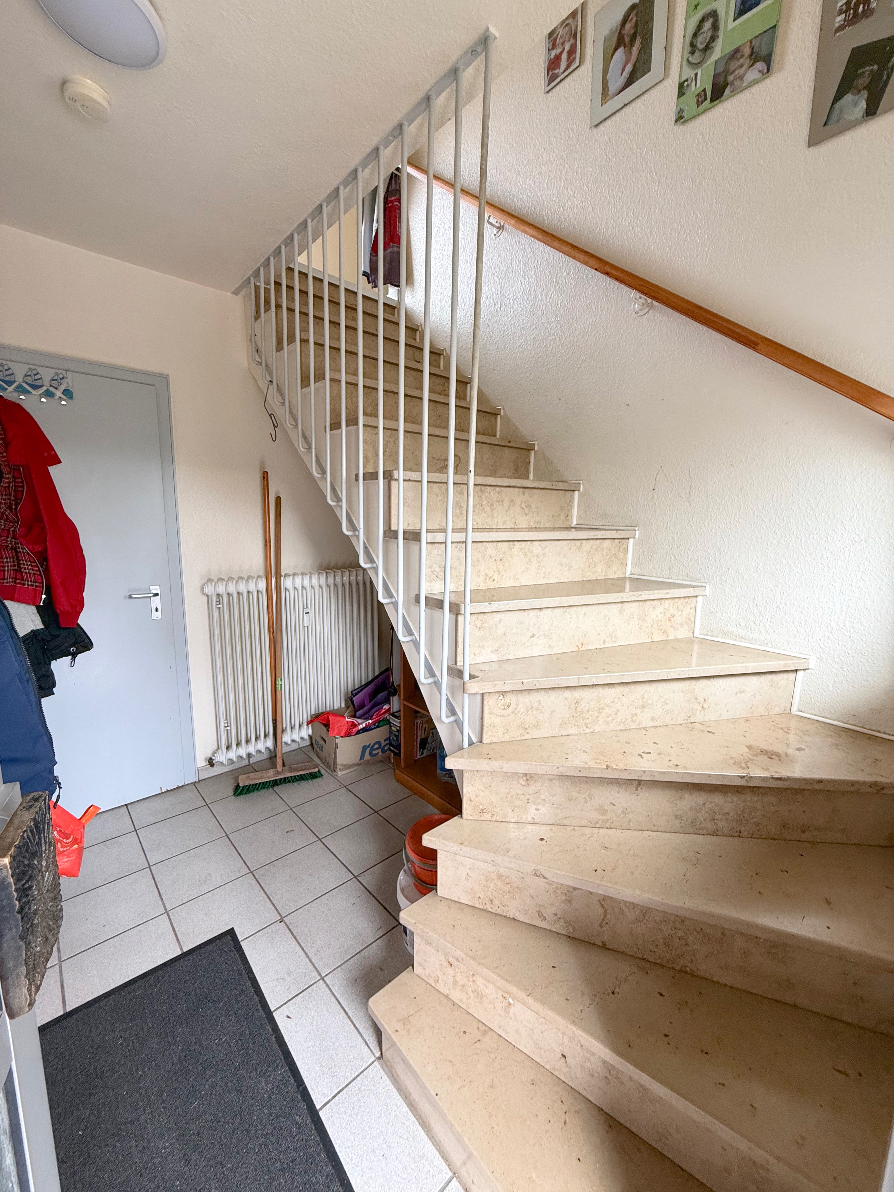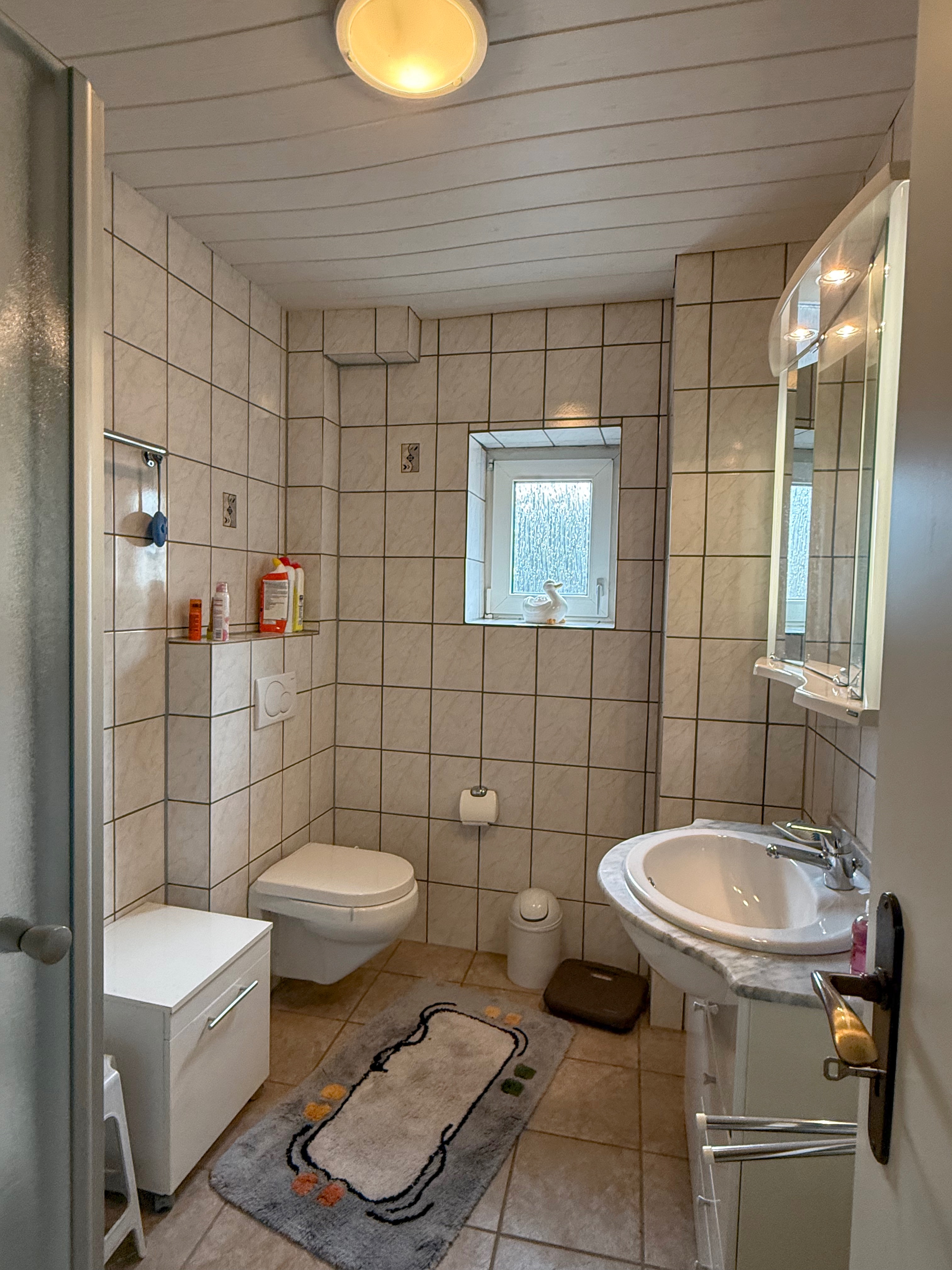 Das Erdgeschoss verfügt über ein Tageslichtbad mit Duschkabine sowie ein separates Gäste-WC. Im Obergeschoss befindet sich ein weiteres Tageslichtbad, ausgestattet mit einer Badewanne.